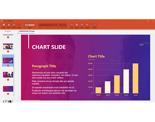 Open your PowerPoint files from application file menu. And it will appear in the screenshot as below, then program will show editor window and begin to view your PowerPoint file.